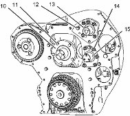 注: 如果卸下軸組件,跳過步驟 12。 需要重新調(diào)整凸輪軸齒輪和可調(diào)惰輪的齒隙。 請參閱測試與調(diào)整, "齒輪總成(前)- 正時(shí)"。