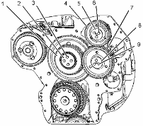 將齒輪組組件 (1) 安置在樞軸上。確保對準(zhǔn)塔齒輪組件與曲軸齒輪上的正時(shí)標(biāo)記。