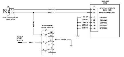 該診斷代碼與系統(tǒng)壓力電磁閥有關(guān)。 FMI 06 意味著 ECM 已檢測(cè)到電路中存在對(duì)接地短路。