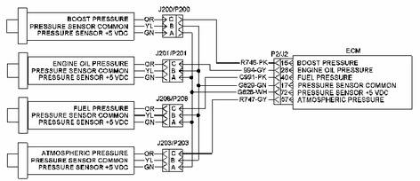 增壓壓力傳感器 發(fā)動機機油壓力傳感器 燃油壓力傳感器 大氣壓力傳感器+5 V 發(fā)動機壓力傳感器電源由 ECM 連接到各個壓力傳感器接頭的接線端 A。 來自 ECM 接頭的傳感器公用線接至每個傳感器接頭的端子 B 上。 傳感器電源受輸出短路保護。蓄電池短路不會對 ECM 內(nèi)部電路造成損壞。