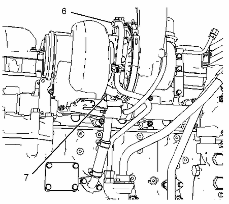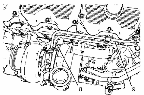 從渦輪增壓器上拆卸冷卻液供應管(8)和冷卻液排放管(9)。檢查管路內(nèi)是否堆積有碎屑或污染物。如果發(fā)現(xiàn)管路內(nèi)有碎屑,確定污染物的來源。必要時修理冷卻系統(tǒng)。