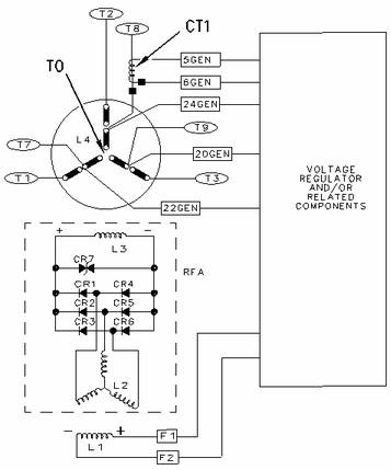 卡特彼勒SR4B 發(fā)電機(jī)自勵(lì)磁發(fā)電機(jī)配線圖 (CR1-C6) 二級(jí)管 (CR7) 變阻器 (L1) 勵(lì)磁機(jī)磁場(chǎng)(定子) (L2) 勵(lì)磁機(jī)電樞(轉(zhuǎn)子) (L3) 主磁場(chǎng)(轉(zhuǎn)子) (L4) 主電樞(定子) (RFA) 旋轉(zhuǎn)磁場(chǎng)總成 (CT1) 選裝的電壓降變壓器 (T0、T1、T2、T3、T7、T8、T9) 發(fā)電機(jī)端子 |