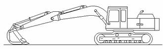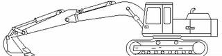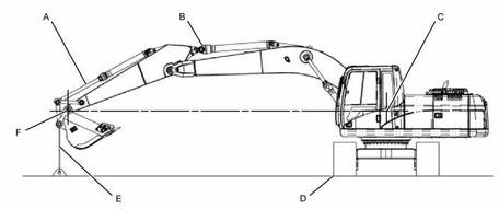 機器的基本位置 (A)鏟斗油缸完全伸出 (B)斗桿油缸完全收回 (C)動臂座架中銷的位置 (D)履帶位置 (E)鏟斗的固定位置 (F)斗桿鼻端中銷的位置 |