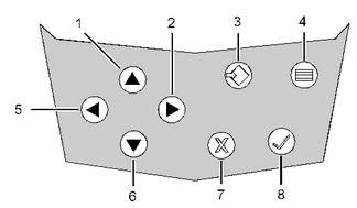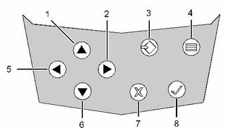 (1)向上鍵 (2)向右鍵 (3)歸位鍵 (4)主菜單鍵 (5)向左鍵 (6)向下鍵 (7)取消鍵 (8)確定鍵 |