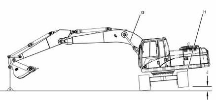 測量泵壓力時機器的位置 (G)動臂油缸的伸出部分 (H)后側(cè)或機器的履帶 (J)履帶與地面之間的空隙 |