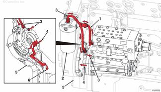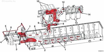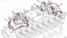 來自康明斯QSK95缸體的機(jī)油 至排氣門搖臂軸的機(jī)油供應(yīng) 至進(jìn)氣門搖臂軸的機(jī)油供應(yīng) 至搖臂軸的機(jī)油供應(yīng) 至搖臂腳的機(jī)油供應(yīng) 至搖臂調(diào)節(jié)螺釘和推管的機(jī)油供應(yīng) 排放至油底殼的機(jī)油。