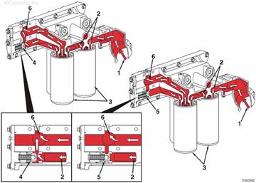 至機(jī)油濾清器座的機(jī)油供應(yīng) 流入機(jī)油濾清器外壁的機(jī)油供應(yīng) 康明斯QSK95機(jī)油濾清器 機(jī)油濾清器旁通閥打開 機(jī)油濾清器旁通閥關(guān)閉 從機(jī)油濾清器流至缸體主油道的機(jī)油供應(yīng)