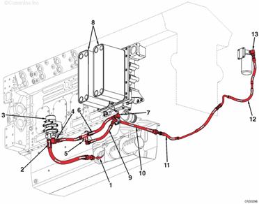 來自機(jī)油油底殼的機(jī)油供應(yīng) 前置機(jī)油泵進(jìn)口 預(yù)潤滑機(jī)油泵 前置機(jī)油泵出口 機(jī)油歧管 至機(jī)油冷卻器的前置機(jī)油供應(yīng) 單向閥 機(jī)油冷卻器芯 至左排的前置機(jī)油供應(yīng) 機(jī)油輸送管 來自右排的前置機(jī)油供應(yīng) 至燃油泵驅(qū)動裝置機(jī)油濾清器座的前置機(jī)油供應(yīng)單向閥。