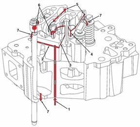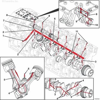 來自濾清器座的機(jī)油供應(yīng) 主機(jī)油油道 至主軸承和曲軸的機(jī)油供應(yīng) 從曲軸流至連桿的機(jī)油 至活塞銷的機(jī)油供應(yīng) 至活塞冷卻噴嘴的機(jī)油供應(yīng) 至凸輪軸和凸輪軸隨動件的機(jī)油供應(yīng) 至凸輪軸隨動件的機(jī)油供應(yīng) 至凸輪軸隨動件軸和滾筒的機(jī)油供應(yīng) 至凸輪軸隨動件滾筒的機(jī)油供應(yīng) 至搖臂的機(jī)油供應(yīng)。