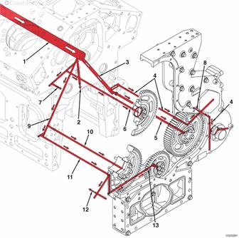 康明斯QSK95主機(jī)油油道 至 1 號主軸承的機(jī)油供應(yīng) 至燃油泵惰輪、燃油泵驅(qū)動裝置機(jī)油濾清器座和左排附件驅(qū)動裝置襯套的機(jī)油供應(yīng)(如果配備) 至齒輪室中的燃油泵驅(qū)動裝置襯套、燃油泵驅(qū)動裝置中的襯套和左排附件驅(qū)動裝置襯套的機(jī)油供應(yīng) 至康明斯QSK95燃油泵惰輪的機(jī)油供應(yīng) 至凸輪軸復(fù)合惰輪的機(jī)油供應(yīng) 至右排附件驅(qū)動裝置的機(jī)油供應(yīng)(如果配備) 至燃油泵驅(qū)動裝置中的襯套的機(jī)油供應(yīng) 至水泵、水泵惰輪和機(jī)油泵惰輪的機(jī)油供應(yīng) 至水泵惰輪的機(jī)油供應(yīng) 至康明斯QSK95水泵和機(jī)油泵惰輪的機(jī)油供應(yīng) 至康明斯QSK95水泵的機(jī)油供應(yīng)