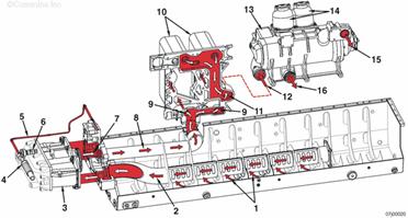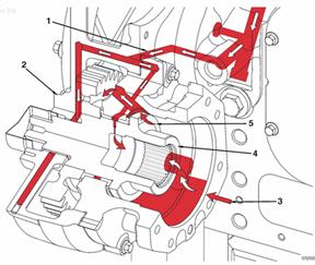 吸油管吸取機(jī)油 至機(jī)油泵的機(jī)油供應(yīng) 機(jī)油泵 主油道壓力調(diào)節(jié)器 機(jī)油壓力信號管 高壓減壓閥 機(jī)油泵出口 至機(jī)油冷卻器的機(jī)油供應(yīng) 至機(jī)油冷卻器芯的機(jī)油進(jìn)口 機(jī)油冷卻器芯 至 Eliminator™ 機(jī)油濾清器的機(jī)油冷卻器出口 流至 Eliminator™ 機(jī)油濾清器的機(jī)油流 Eliminator™ 機(jī)油濾清器 離心機(jī) 至缸體主油道的 Eliminator™ 機(jī)油濾清器出口 從離心機(jī)通過缸體檢修孔蓋排放至油底殼的機(jī)油