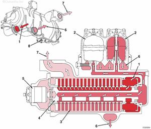 來自缸體主油道的機(jī)油供應(yīng) 機(jī)油供應(yīng)歧管 至左排渦輪增壓器的機(jī)油供應(yīng) 至右排渦輪增壓器的機(jī)油供應(yīng) 渦輪增壓器機(jī)油回油管 排放至油底殼的機(jī)油。