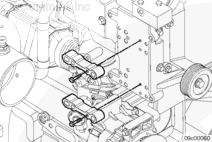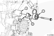利用導向適配器上的定位銷(4)(如果配備),將惰輪皮帶輪(1)和導向適配器(2)軸與皮帶張緊輪支架(3)對正。使用一個墊圈和螺栓,將皮帶惰輪皮帶輪和軸安裝在皮帶惰輪支架上。擰緊螺栓。扭矩值: 30 n.m [25 ft-lb]。安裝防塵密封圈。