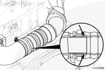 確保軟管端附近的凹槽滑過 EGR 閥安裝支架上的軟管密封條。在此鋸齒狀凹槽內(nèi)定位軟管卡箍。擰緊軟管卡箍。