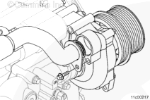 注: 要拆卸和安裝水泵,早期的、在中間鋁制皮帶張緊器惰輪支架上沒有縫槽的發(fā)動機需要拆下減振器。