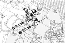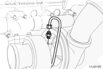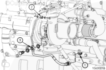 在供油管接頭上安裝渦輪增壓器供油軟管。供油軟管必須朝正下方,以便正確連接到機(jī)油濾清器座上的供油管接頭上。