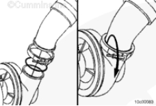 按正確的方位放置新的 v 形帶箍,并擰緊鎖緊螺母。Cummins® 渦輪增壓器的扭矩值。