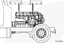 選用適當(dāng)額定提升能力的吊車,將發(fā)動機(jī)提升工具(零件號 3162871)安裝到發(fā)動機(jī)吊耳上,以安裝發(fā)動機(jī)。