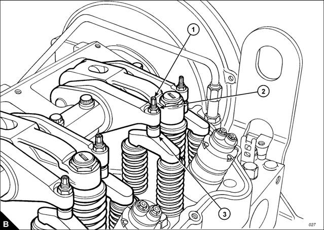 7 Use a set of feeler gauges, inserted at the position shown (B) between the valve bridge piece and the rocker