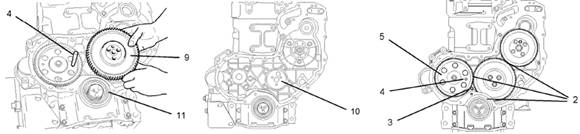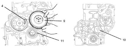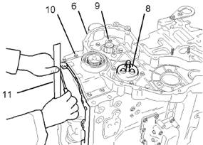 6.從缸體凹槽(10)中拆下惰齒輪(8)的組件(9)。向前移動組件時,必須將組件(9)吊到曲軸前油封(11)殼體的上方。