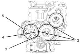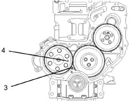 2.確保1號氣缸仍處在其壓縮沖程的上止點位置。如有必要,請參閱《Perkins1103/1104柴油發(fā)動機(jī)測試和調(diào)整手冊》,“查找1號活塞的上止點位置”。確保安裝了曲軸正時銷(3)和凸輪軸正時銷(4)。