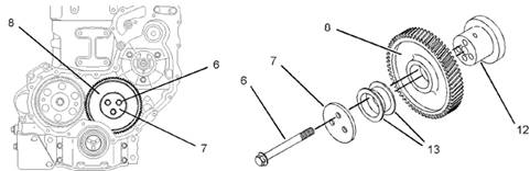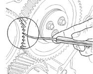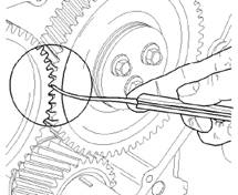 10.檢查惰齒輪和曲軸齒輪之間的齒隙。更多信息,請參閱《技術(shù)參數(shù)手冊》,“前齒輪總成”。