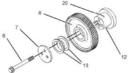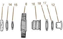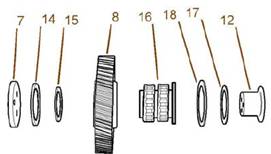 7.解體惰齒輪(8)的組件(9)和輪轂。為了解體標(biāo)準(zhǔn)組件(9),將輪轂(12)滑出惰齒輪(8).檢查惰齒輪(8)中的襯套(13)有無磨損或損壞。如有必要,從惰齒輪(8)的每側(cè)拆下襯套(13)。