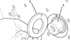 3.將一層少量、連續(xù)(12)的21820603POWERPARTRetainer(耐油)涂到軸承(9)的內(nèi)表面上。將軸承(9)內(nèi)座圈的正面放置到一個合適的支座上。將齒輪(7)較小的軸按入軸承(9)中,使齒輪的肩抵到軸承上。清除所有多余的密封膠。
