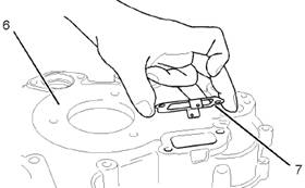 6.參見圖例190,并且檢查惰輪和齒輪(7)之間的齒隙。齒隙應(yīng)為0.11mm(0.004in)至0.17mm(0.007in)。