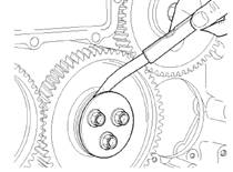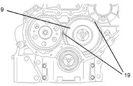 注:組裝惰齒輪和輪轂的組件(9)時,確保惰齒輪(8)上的標(biāo)記(19)朝向發(fā)動機(jī)前端。