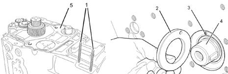 1.徹底清潔缸體上前齒輪室的配合面。將兩個臨時用雙頭螺柱(1)裝入缸體中。確保止推墊圈(2)與空心定位銷(3)對齊。將止推墊圈安裝到凸輪軸(4)上。將新的接頭(5)安裝到缸體上。