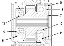 4.將一層少量、連續(xù)(14)的21820603POWERPARTRetainer(耐油)涂到軸承(8)的外表面上。將一層少量、連續(xù)(13)的21820603POWERPARTRetainer(耐油)涂到軸承(8)的內(nèi)表面上。確保軸承(9)內(nèi)座圈的前面仍在一個合適的支座上。將軸承(8)按壓到齒輪(7)的較大軸上,直至軸承(9)靠到齒輪的肩上。清除所有多余的密封膠。
