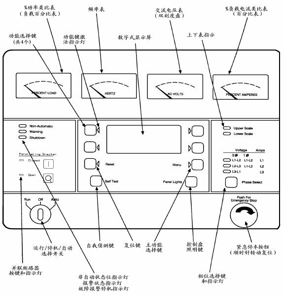 顯示屏功能選擇鍵:4個(gè)瞬間按鍵,在數(shù)字式顯示屏每側(cè)各有2個(gè),用以進(jìn)入多種功能選項(xiàng)和調(diào)整發(fā)電機(jī)組參數(shù),當(dāng)按鍵可以使用時(shí)將有一綠色箭頭燈在旁指示(表示該按鍵可以使用)。