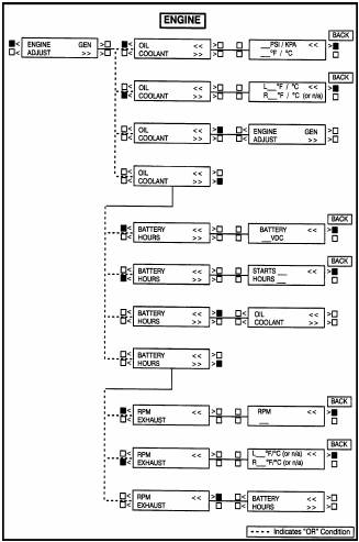 下一頁顯示了主功能和一些子功能的方框圖。如圖所示,主功能可進(jìn)一步分為四個(gè)子功能。如果需要顯示發(fā)動(dòng)機(jī)參數(shù),如機(jī)油壓力和機(jī)油溫度、水溫、發(fā)動(dòng)機(jī)轉(zhuǎn)速(RPM)和排煙溫度等,按顯示屏上“ENGINE”(發(fā)動(dòng)機(jī))附近的按鍵,參考本章“ENGINEMEMU”(發(fā)動(dòng)機(jī)功能)。