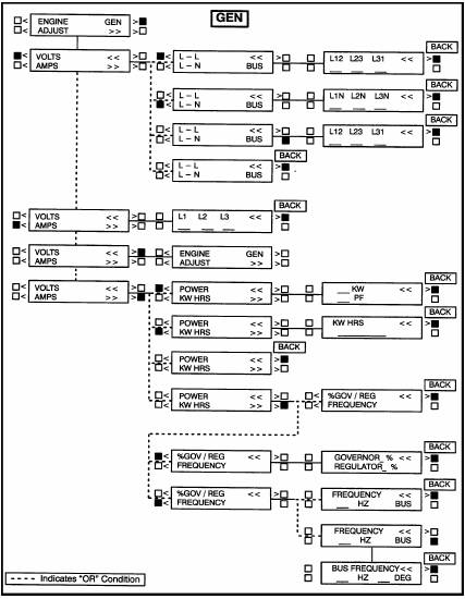 >”旁的按鍵將進(jìn)到調(diào)速器/調(diào)壓器/頻率(%GOV/REG/FREQUENCY)子功能。選擇%GOV/REG(調(diào)速器/調(diào)壓器)以最大值的百分?jǐn)?shù)顯示調(diào)壓器和調(diào)速器的調(diào)節(jié)開度;選擇FREQUENCY(頻率)顯示發(fā)電機(jī)的輸出頻率、母排頻率或系統(tǒng)的同步信息。在顯示調(diào)壓器/調(diào)速器或頻率參數(shù)的狀態(tài)下,按“<<”旁的按鍵顯示屏將回到(“BACK”)調(diào)速器/調(diào)壓器/頻率(%GOV/REG/FREQUENCY)子功能。