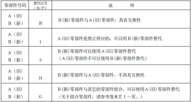 圖解中表示了基準(zhǔn)號碼?;鶞?zhǔn)號碼表示3~4位時,前面的1~2位相對于此組裝零部件的基準(zhǔn)號碼,后面的2位,原則上,是每個構(gòu)成零部件的補充號碼。(3) 零件編號記載著可以供應(yīng)的原廠純正零部件的號碼。