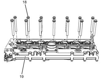 16.將合適的起吊設(shè)備連接到缸蓋(19)。支撐住缸蓋的重量。缸蓋的重量約為96kg(212lb)。