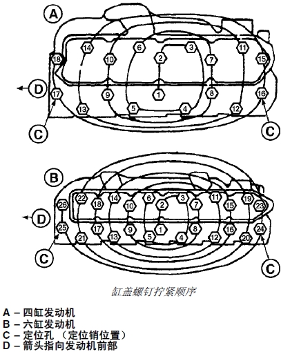 3. 擰緊所有帶帽螺釘(按上面所示位置)直到套筒扳手上的第二個(gè)標(biāo)記 (B) 與缸蓋上的標(biāo)記 (C) 對齊為止。