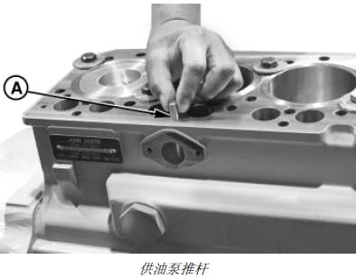 1. 安裝缸蓋前,在供油泵推桿 (A) (如果裝備)上涂抹干凈的John Deere約翰迪爾強(qiáng)鹿柴油發(fā)動(dòng)機(jī)潤滑油,然后小心地裝到缸體中。