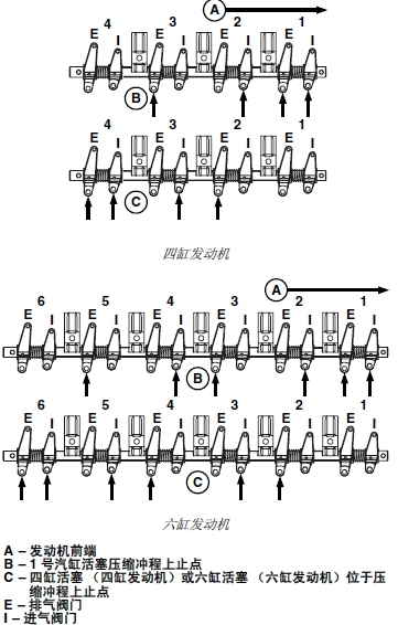 3. 將曲軸旋轉(zhuǎn) 360°。將 6 號(hào)汽缸活塞鎖定在壓縮沖程上止點(diǎn) (C)。