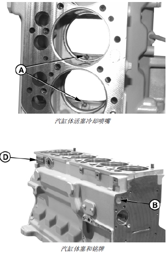 7. 汽缸體保養(yǎng)后,重新安裝活塞冷卻噴嘴。(參見本章后面“拆卸、檢查和安裝活塞冷卻噴嘴”部分。)