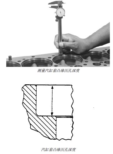 測量汽缸體內(nèi)汽缸套凸緣沉孔深度并與下列技術(shù)規(guī)格進(jìn)行比較。如果沉孔深度不符合技術(shù)規(guī)格要求,可安裝汽缸套墊片。