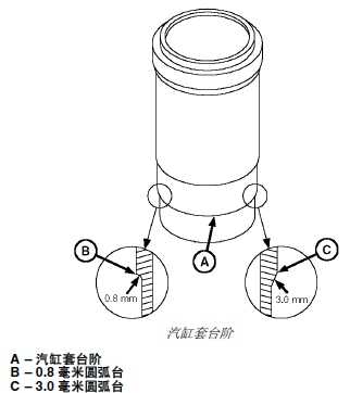 老式汽缸套機(jī)加工時(shí)有 0.8 毫米的圓弧臺(tái),安裝過程中,可能會(huì)使密封圈受到損壞。裝對于這類汽缸套,要用油石或砂布將臺(tái)階的銳邊 (B) 倒成 45° 度角。裝新汽缸套采用 3.0 毫米圓弧臺(tái) (C),安裝時(shí)不會(huì)損壞密封圈。裝