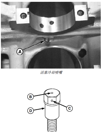 1. 拆卸并清洗每個(gè)活塞冷卻噴嘴 (A),確保冷卻噴嘴未堵塞或損壞。如果懷疑有問題,則應(yīng)更換。