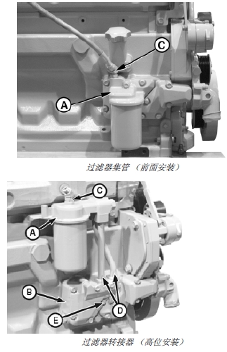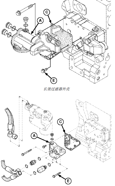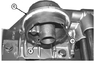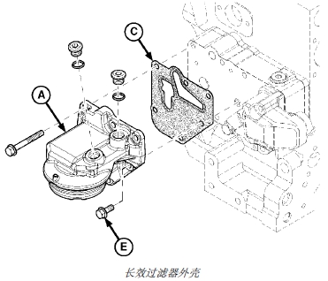 對于配備長效過濾器的John Deere約翰迪爾強鹿柴油發(fā)動機:在內(nèi) (B) 外 (A) 密封和過濾器螺紋上涂一層干凈的機油。用干凈的布子擦拭集管的兩個密封面(D 和 E)。確保防塵密封 (C)位于集管的正確位置上,并且密封翼片要與蓋槽對齊。如果損壞,更換密封。安裝機油過濾器并用手擰緊,直到貼緊防塵密封墊。密封墊接觸后不得像安裝其他過濾器一樣再擰緊 1/2 - 3/4 圈。