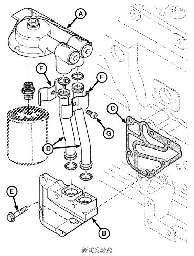 注意: 舊式John Deere約翰迪爾強鹿柴油發(fā)動機的油管 (D) 是彎管轉(zhuǎn)接器 (A) 的一部分,且不使用 O 形環(huán) (E)。確保 O 形環(huán) (C) 正確安裝在正時齒輪蓋冷卻液端口的槽中。