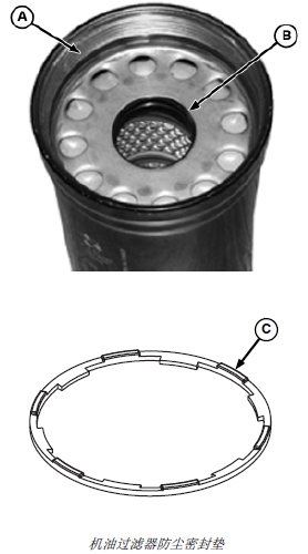 重要提示: 不得使用過濾器扳手安裝過濾器。只能用手安裝過濾器。對于裝配長效過濾器的John Deere約翰迪爾強鹿柴油發(fā)動機,確保防塵密封的翼片 (C) 正確安裝在殼體槽中,然后安裝過濾器。