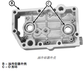 5. 拆下 O 形環(huán) (C),檢查 O 形環(huán)安裝槽的表面光潔度。如果用指甲可以感觸到有劃痕,應更換機油冷卻器的外殼。外,如果密封槽中有大于 0.5 毫米(0.20英寸)的砂眼,也應更換外殼。