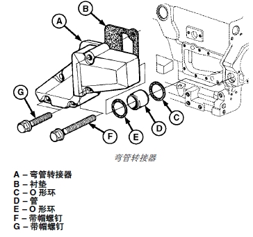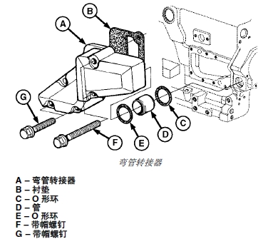 5. 安裝襯墊 (B)、O 形環(huán)(C 和 E)、油管 (D) 和彎管轉(zhuǎn)接器 (A)。用帶帽螺釘(F 和 G)將彎管轉(zhuǎn)接器固定在John Deere約翰迪爾強鹿柴油發(fā)動機上。按規(guī)格要求擰緊帶帽螺釘。