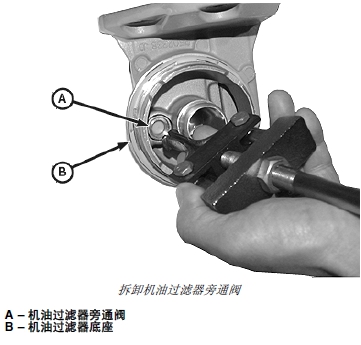 2. 對于高位安裝、前后安裝的機油過濾器,必要時可拆卸機油過濾器集管和油管及轉(zhuǎn)接器/ 冷卻器蓋。(參見本章“拆卸、檢查和安裝機油過濾器底座”部分。)
